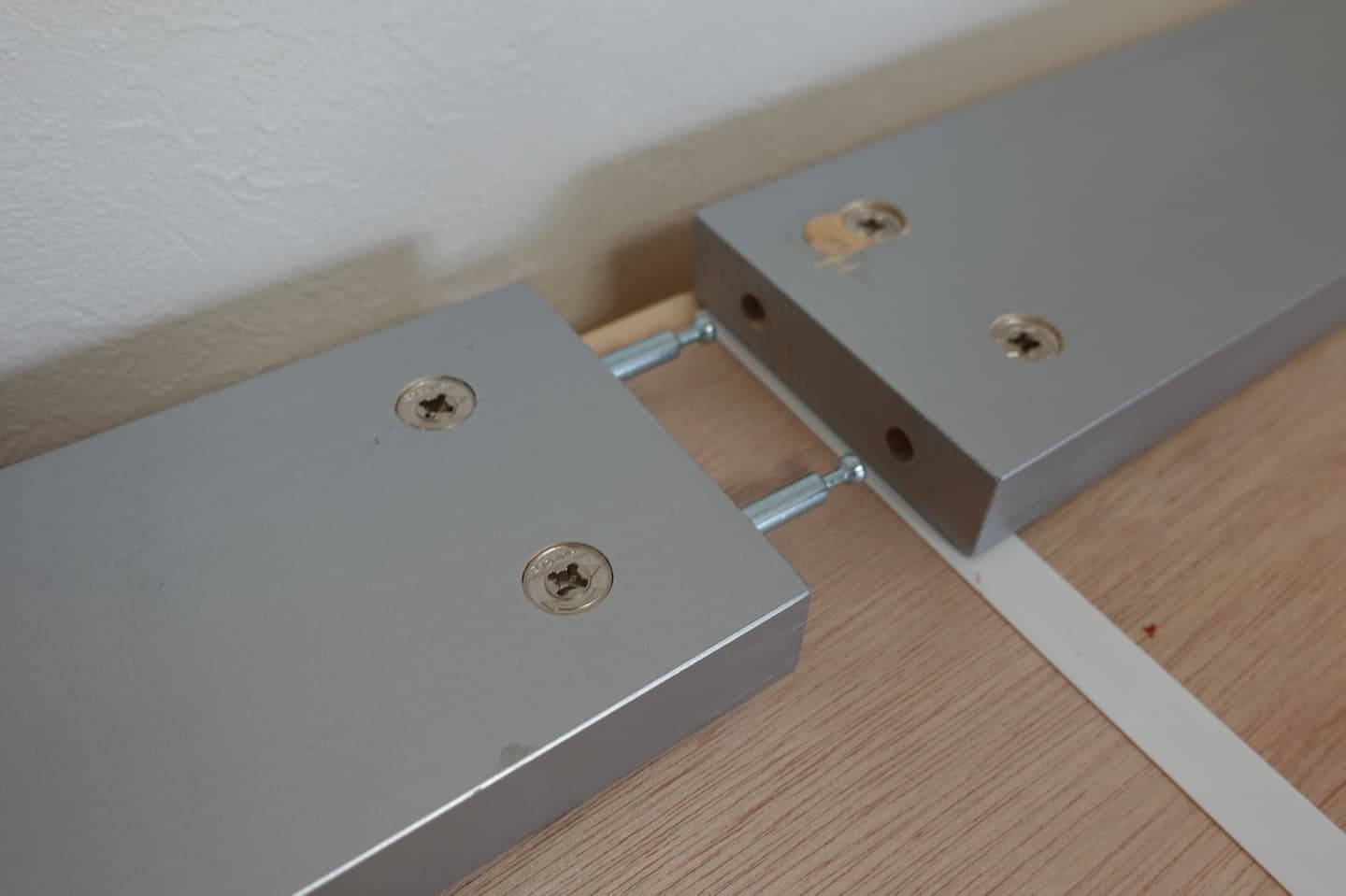 まずはシルバー(画像P8-08)、次に黒(画像P8-09)と横板の連結をやっていきます。左右少しづつ締めていきますが、最後はしっかり締めて下さい。