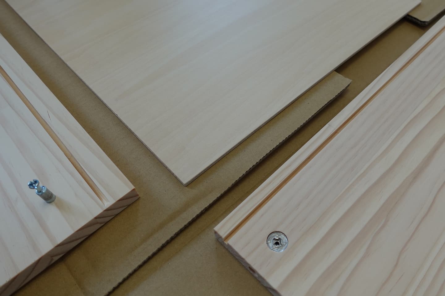 最初のネジ止めとしては下の板に対して横真ん中の板を立ててダボ穴にピンを入れます。下の画像003にする為の作業になります。