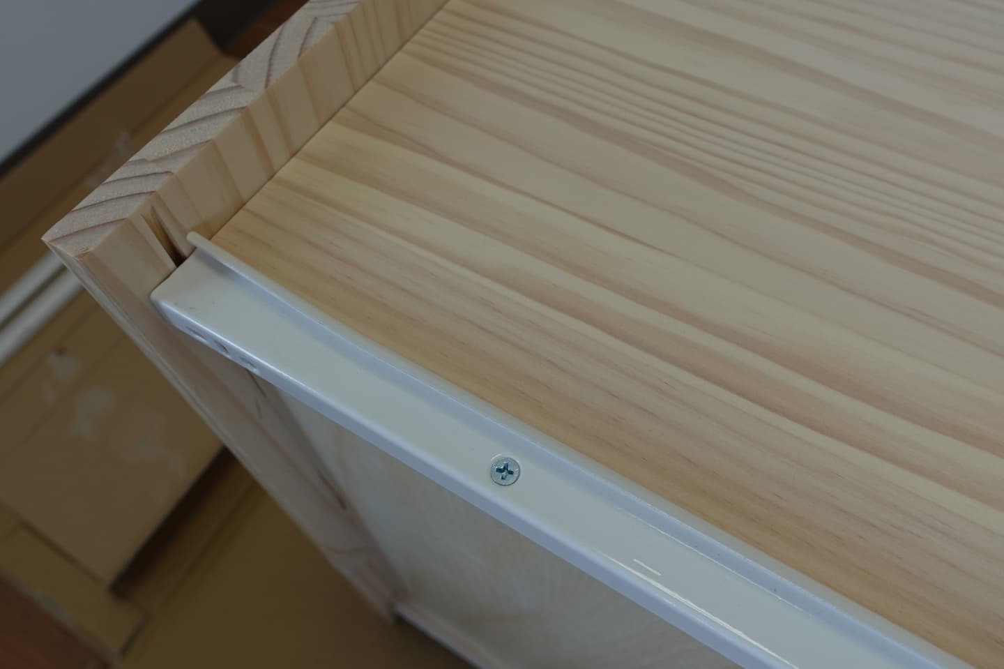 (画像P01-07)最後に引き出しの正面の板を合わせます。(画像P01-08)正面の板は少し大き目になっています。中のダボ穴とピンをしっかり締めます